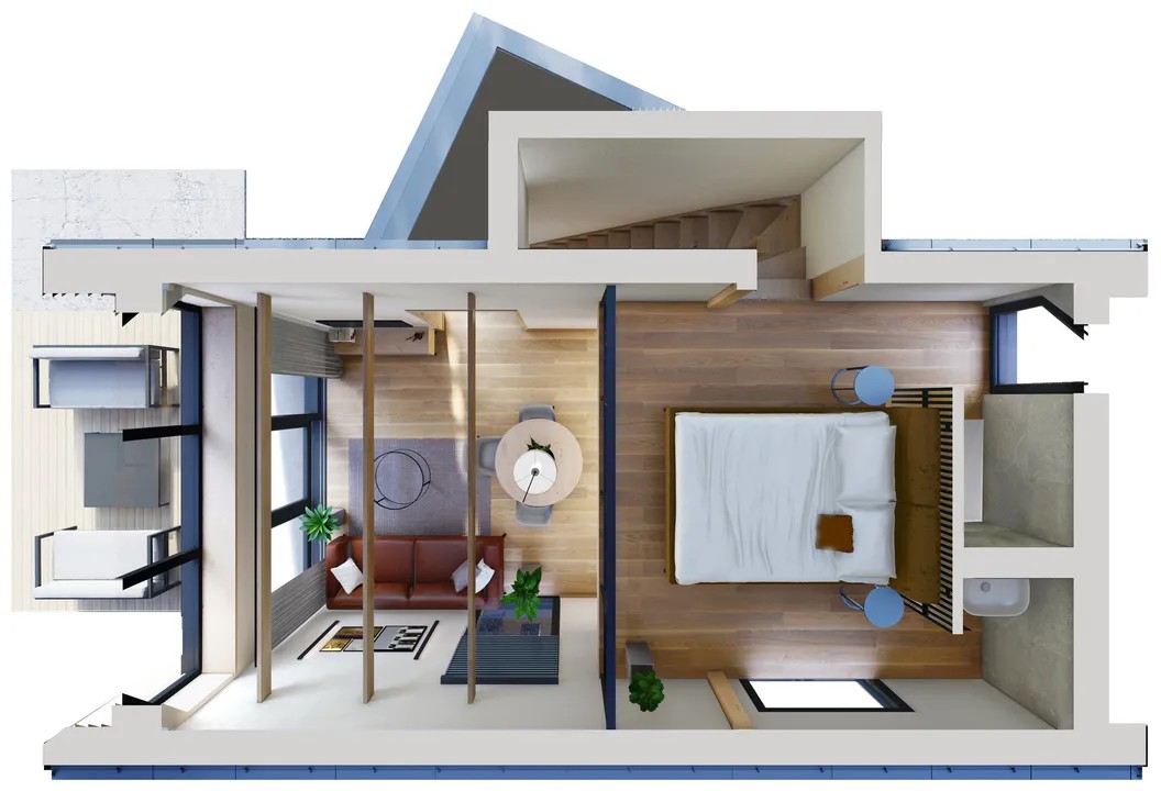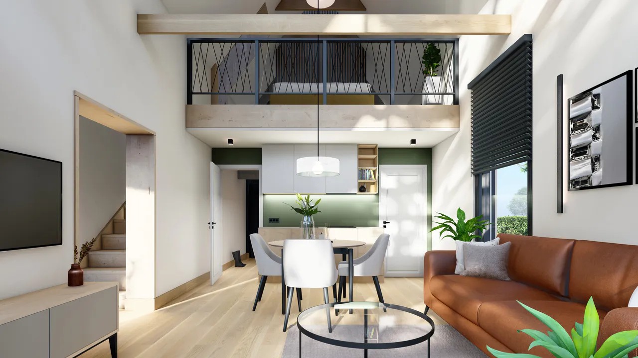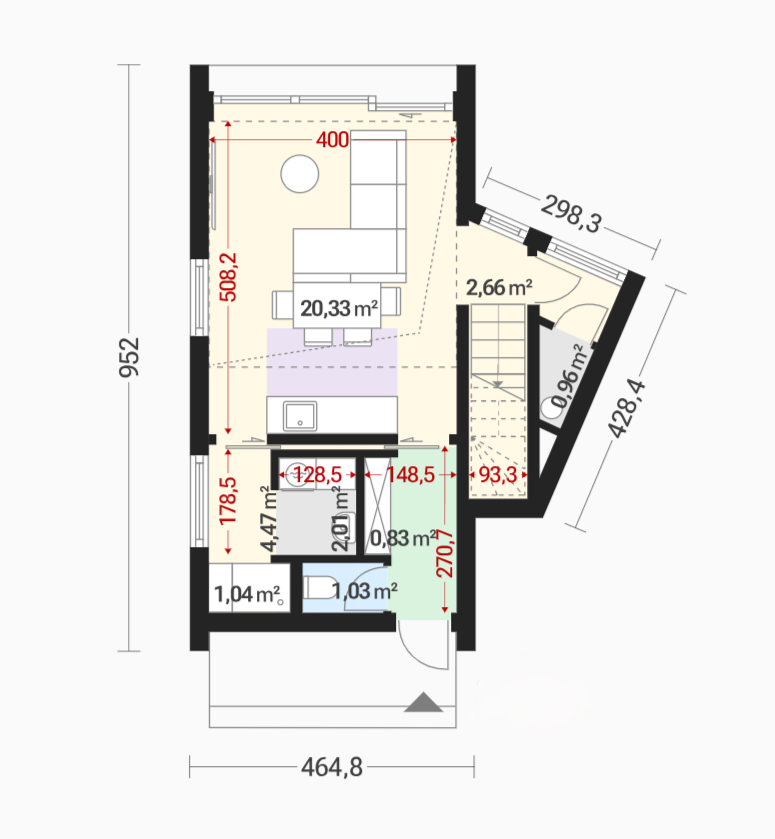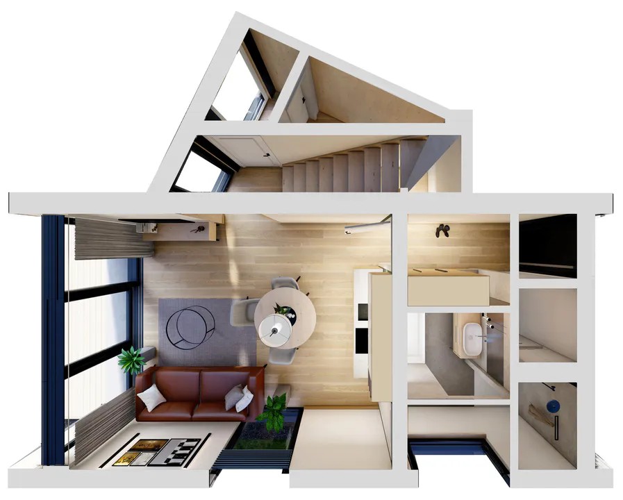 Живите в гармонии с природой и комфортом в доме проекта "Барн". Общая площадь 50 кв.м включает просторные помещения первого этажа — объединенную кухню-гостиную, удобную зону санузла, техническое помещение и функциональный коридор. Лестница ведет на второй уровень, который может быть оформлен либо как воздушное пространство второго света со спальней, либо изолированной комнатой для максимального уюта и приватности. Идеальное решение для ценителей стиля и функциональности!