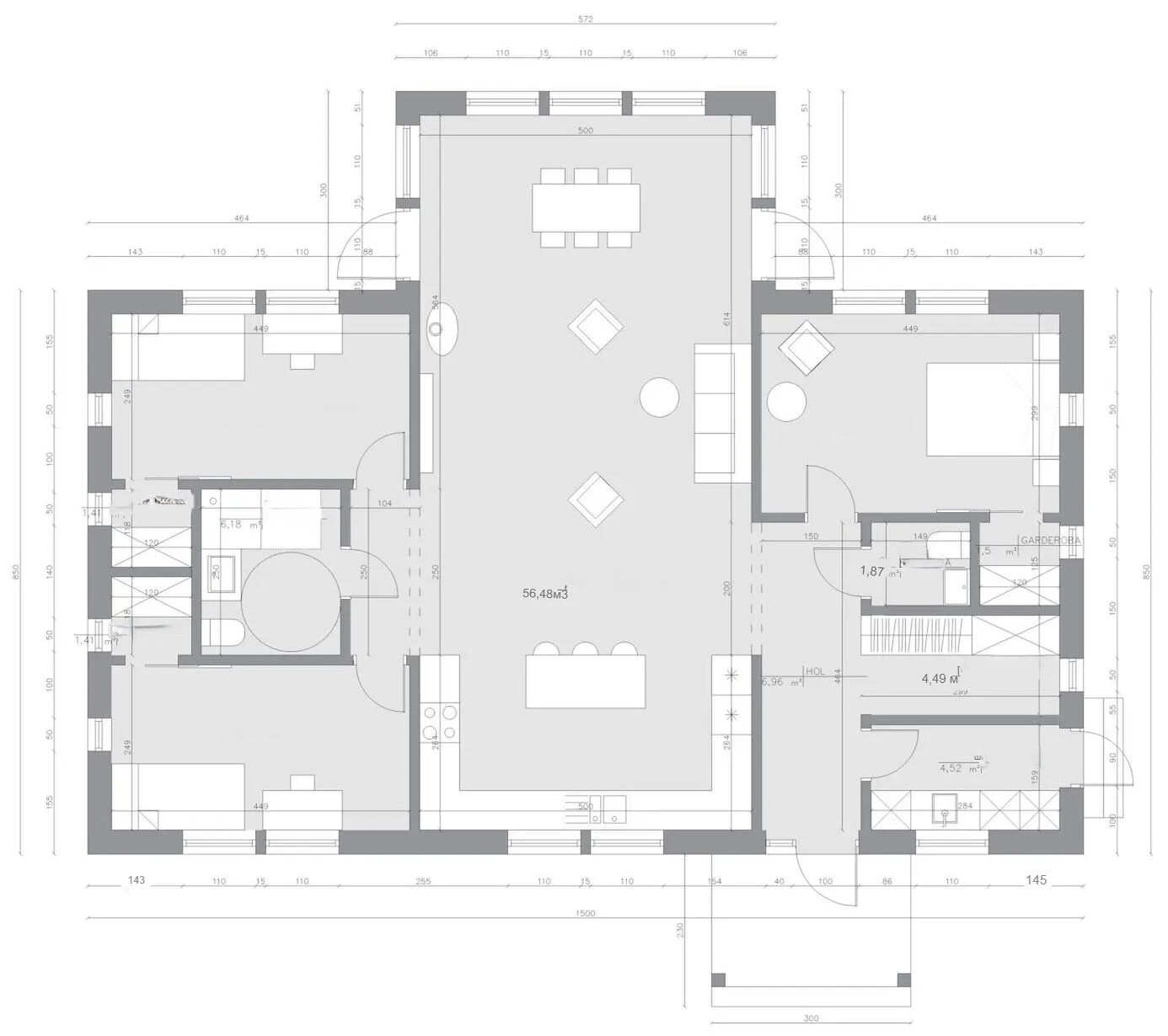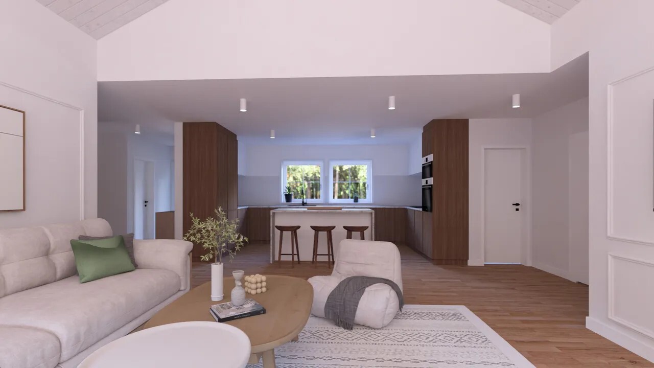 Прекрасный проект для комфортной жизни включает в себя огромную кухню гостиную со вторым светом, две спальни разделенные санузлом и собственными гардеробными, отдельную мастер спальню со своим санузлом и гардеробом, коридор и тех. помещение под ваши задачи.