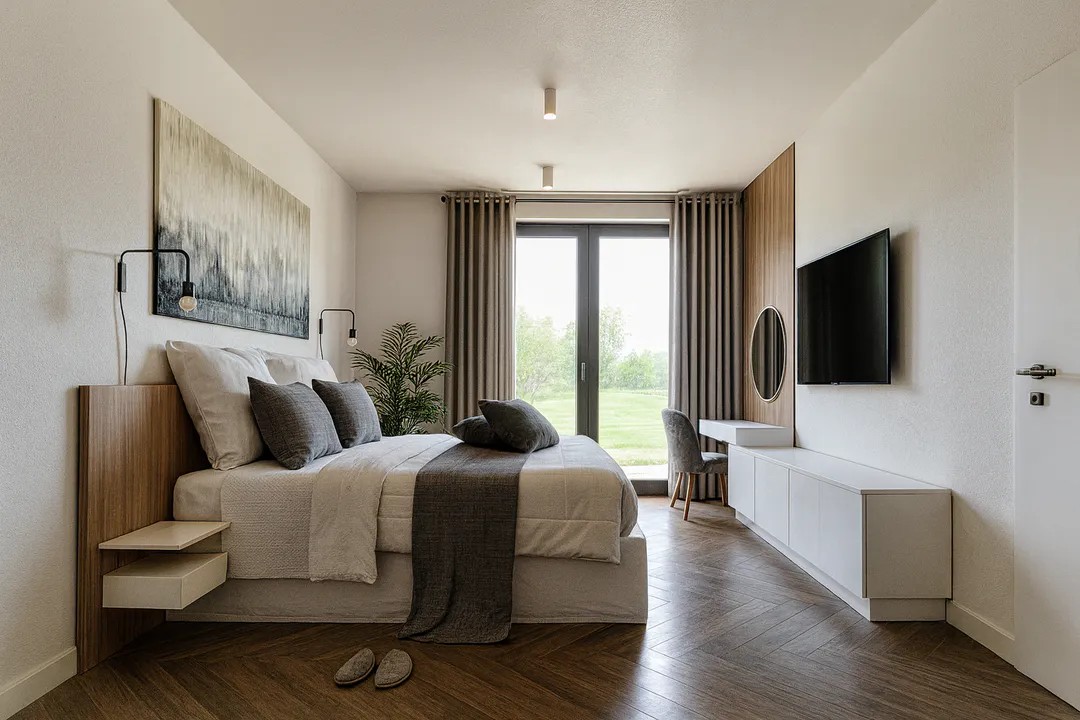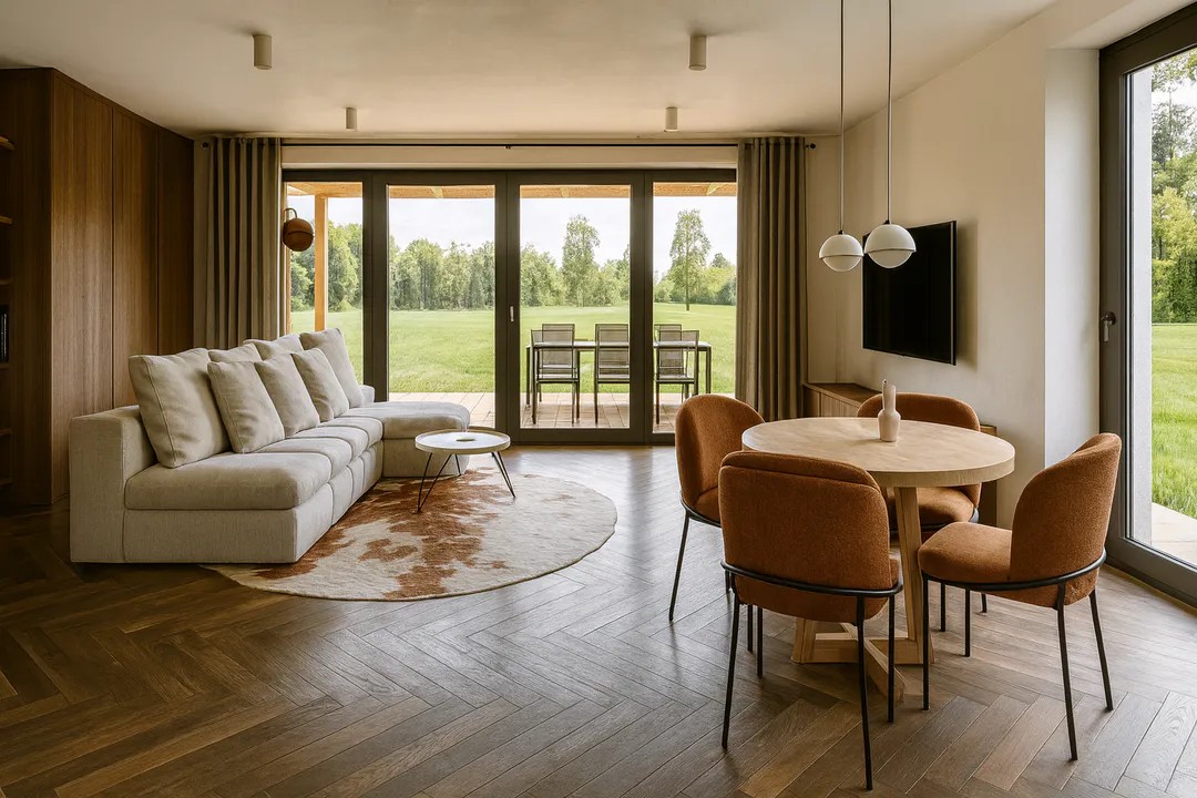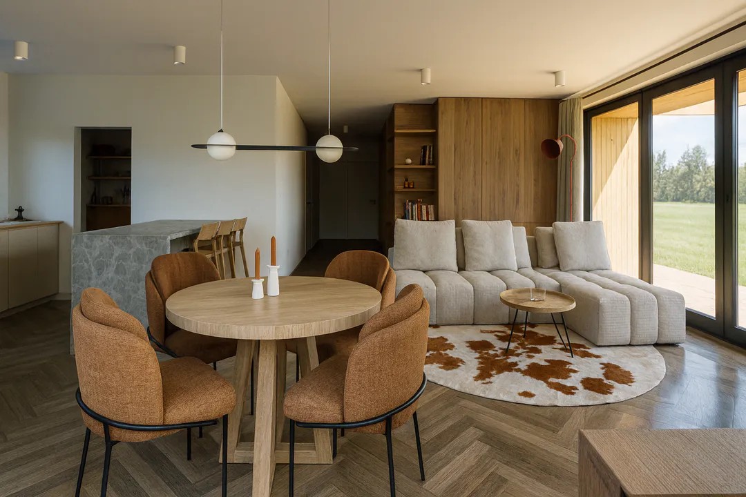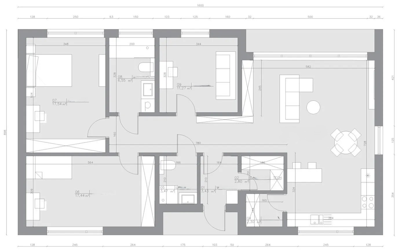 Просторный и очень функциональный по площади. В дом вместились три больших спальни, два санузла, большая кухня гостиная с кладовой в кухонной зоне, гардеробная и коридор. Имеется терраса.